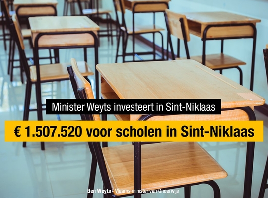 Vlaams minister van Onderwijs Ben Weyts (N-VA) investeert € 1.507.520 in scholen in Sint-Niklaas. “We kunnen de onderwijskwaliteit enkel verhogen wanneer we ook in infrastructuur blijven investeren”, zegt Vlaams minister van Onderwijs Ben Weyts. “Net daarom beslisten we deze regeerperiode € 500 miljoen extra in schoolinfrastructuur te investeren.