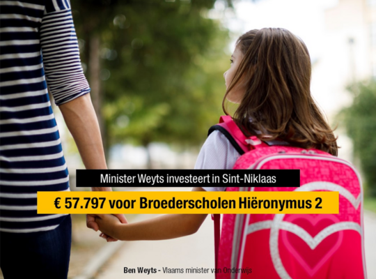 Vlaams minister van Onderwijs Ben Weyts (N-VA) investeert € 57.797 in Broederscholen Hiëronymus 2 in Sint-Niklaas. “We blijven investeren in de kwaliteit van ons onderwijs. Dus ook in de onderwijsinfrastructuur”, zegt Weyts. “Onze leerlingen en leraren horen in de beste omstandigheden onderwijs te kunnen volgen en geven,” zegt Weyts.