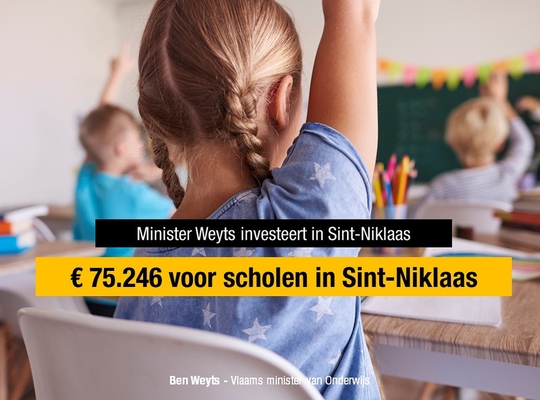 Vlaams minister van Onderwijs Ben Weyts (N-VA) investeert € 75.246 in scholen in Sint-Niklaas. “Deze regeerperiode kunnen we met de extra investeringsimpuls van een half miljard euro de grootste noden ledigen” zegt Weyts. Naast nieuwbouw staan er ook heel wat kleinere ingrepen, zoals dringende werken omwille van overmacht gepland, opdat elk kind veilig en comfortabel naar school zou kunnen gaan.”