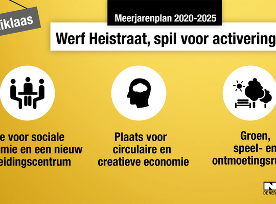 “Uit een recente ruimtelijk-economische studie blijkt dat de oude industriesite in de Heistraat veel kansen biedt. Ten eerste kunnen we deze plek samen met onze economische partners doen heropleven. Het wordt een broedplaats, een ‘site van kansen’, waar kennis en ervaring over circulaire en sociale economie uitgewisseld worden met het Waasland. Naast die economische invulling willen we met deze ‘verweven werklocatie’ ook een mooi evenwicht creëren tussen werken en wonen. Zo kunnen we ook een antwoord bieden op de vragen van de buurt naar meer speelgroen en speelprikkels.” - Ine Somers, schepen voor economie Sint-Niklaas