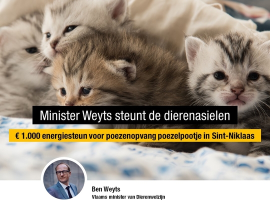 Vlaams minister van dierenwelzijn Ben Weyts steunt dierenasiel Poezenopvang poezelpootje in Sint-Niklaas met een eenmalige energiesteun van € 1.000. “Niet enkel gezinnen en bedrijven werden geconfronteerd met een fors gestegen energiefactuur”, zegt Weyts. “De dierenasielen krijgen nu een tegemoetkoming voor de hoge energieprijzen van de afgelopen maanden, zodat ze hun goede werk kunnen verderzetten.”